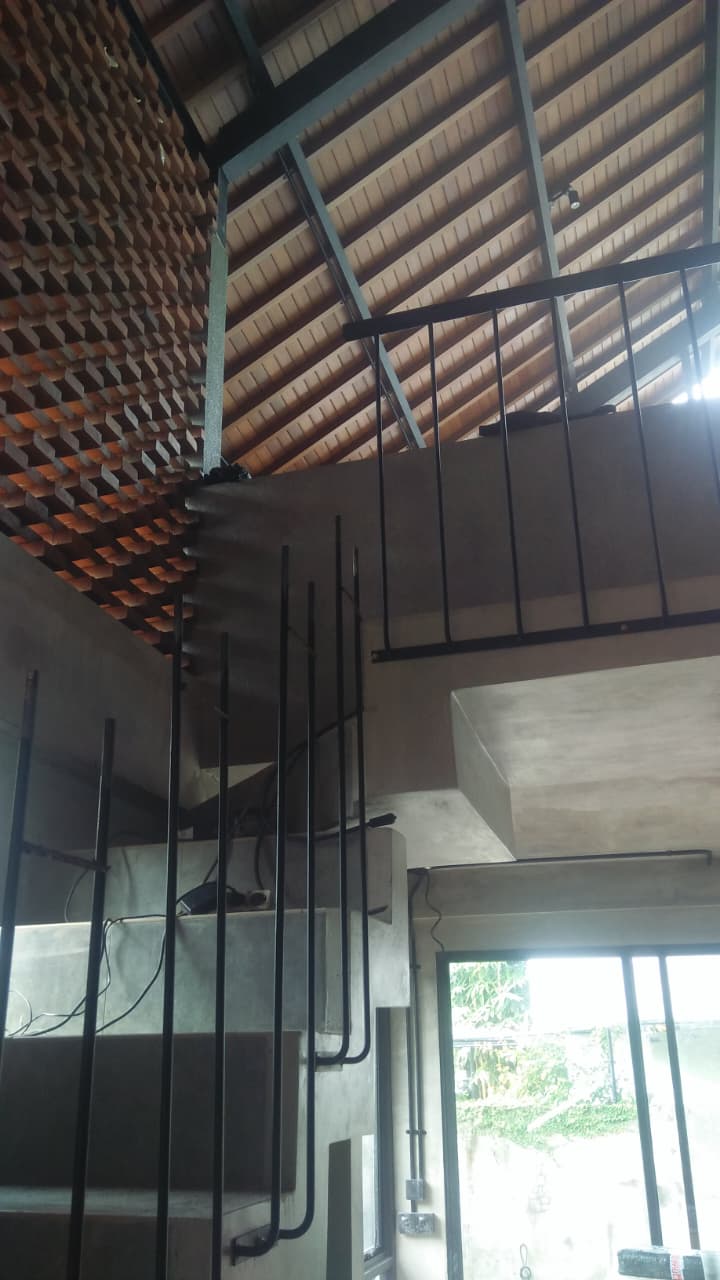 Pengerjaan tangga besi dan struktur mezzanine yang kokoh dan presisi.